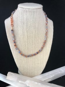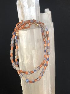 African Splendor is made with vintage African trade beads from the 1800’s. These African trade beads are rich in cultural tradition. Accented by African copper and gold. Each trade bead has a unique color, size and shape representing a sacred and significant tradition for the culture that made the bead. Each trade bead is a form of currency to the indigenous culture that made them. When you wear trade beads you are wearing thousands of years of sacred tradition and benevolent wealth.