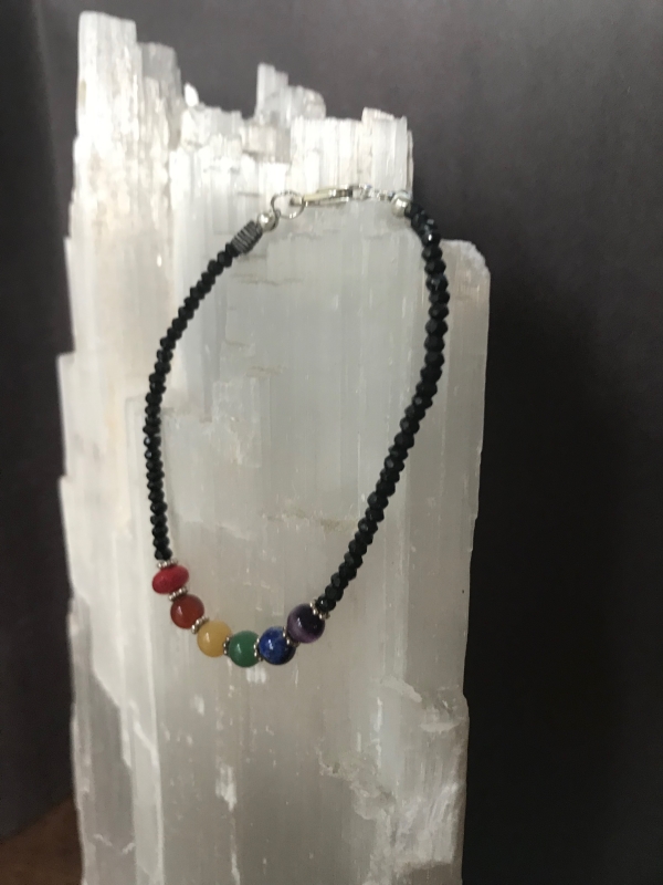 Chakra Bliss Bracelet is made with the following semiprecious stones: Black Spinel, Vintage Fire Coral, Lapis, Amethyst, & Carnelian. The silver spacers are Bali silver. Chakra Bliss is finished with sterling silver and pewter findings.
