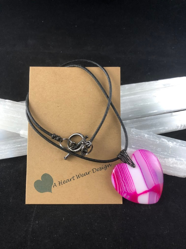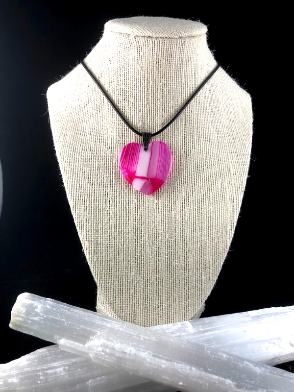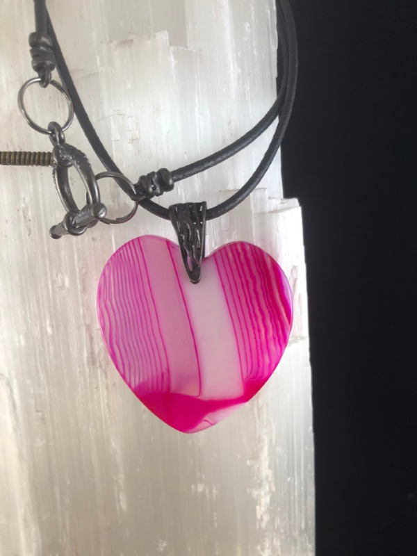 Healing heart is pink and white and flows with healing and nurturing energy. Pink is associated with the heart, third eye and, crown chakras. This healing heart represents happiness, joy, sweetness and sensitivity. It allows for you to connect with the tender and compassionate energy inside of you. Healing Zen Heart is made with pink agate, recycled rubber and bronze findings.