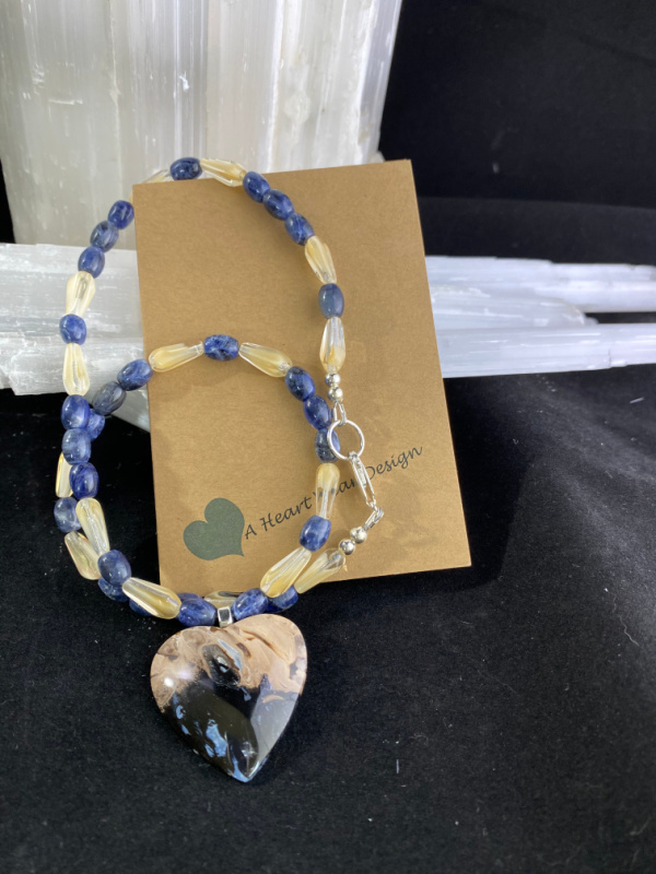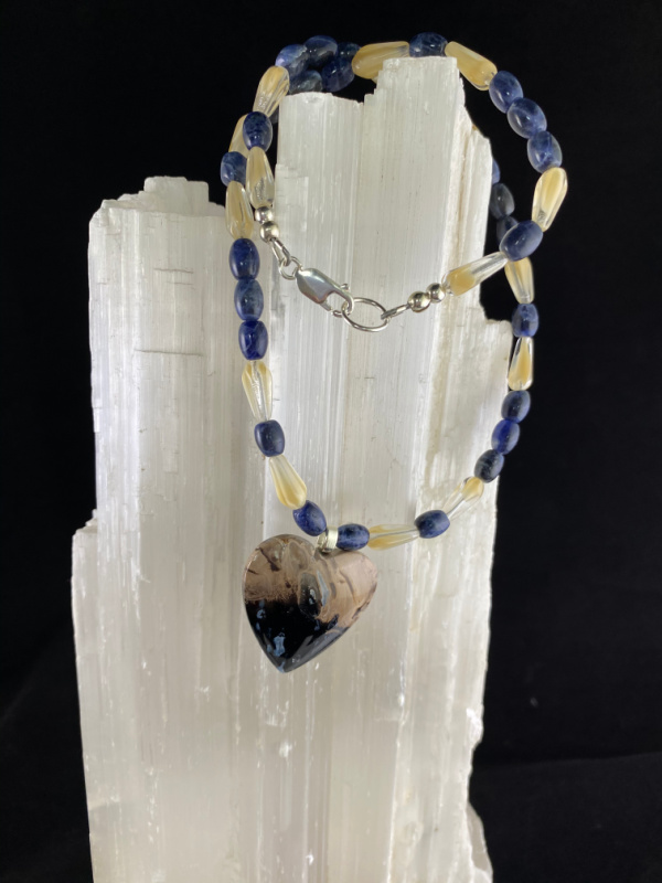 Indigo Heart is made with Vintage Glass, Lapis Lazuli, Maple Wood, and Sterling Silver. Indigo Heart allows one to face challenges and thrive. Indigo Heart gives us the ability to access our inner strength.