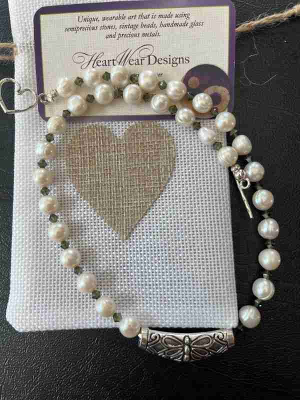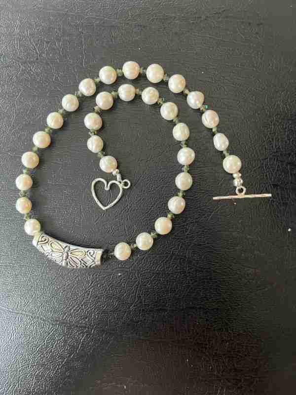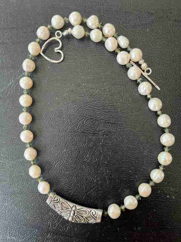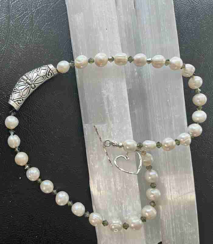 Made with: Dark green Crystals and Fresh water Pearls and a sterling silver focal bead. Finished with a sterling silver toggle made by Tibetan monks.